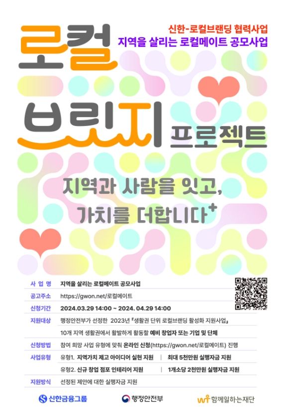 [제주교통복지신문 송한신 기자] 행정안전부는 3월 29일부터 신한금융지주회사(회장 진옥동, 이하 ‘신한금융’)와 '로컬브랜딩 사업을 통한 지역경제 활성화 협력사업, 로컬브릿지 프로젝트'에 착수한다고 밝혔다.