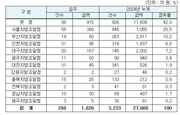 지역별 발주량을 보면 대전광역시 소재 본청 915억 원, 서울지방청 366억 원 등 2개청(1,281억 원)이 전체 금액(1,826억 원)의 70.2%를 차지하고 있으며, 인천 등 나머지 10개 지방청 545억 원이 각각 집행될 예정이다.