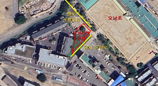 오남초교 정문 앞 통학로는 폭 3~4m, 길이 75m 정도로 그 끝이 정문과 연결되는 막다른 도로로 차량 교행이 불가하고, 일부 보도와 차도가 분리되지 않은 상황에서 오남초교 진출입만을 위해 쓰이고 있었다.