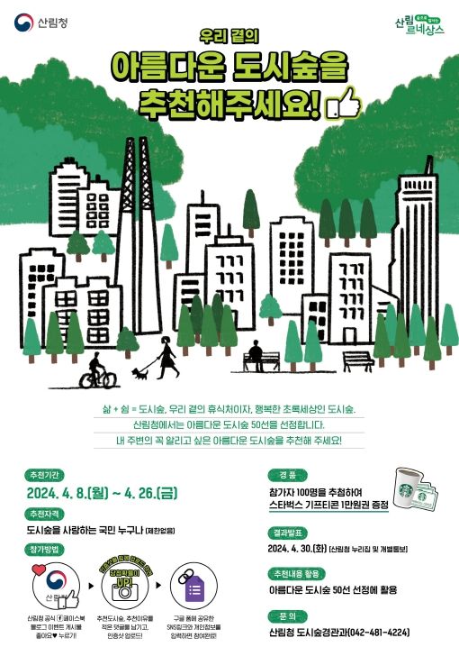 국민추천은 오는 8일부터 26일까지 산림청 누리집과 산림청 페이스북․블로그 ‘아름다운 도시숲 추천 이벤트’에서 누구나 참여 가능하며 추천하고 싶은 도시숲과 추천 이유, 인증사진을 남기면 소정의 선물도 증정한다.