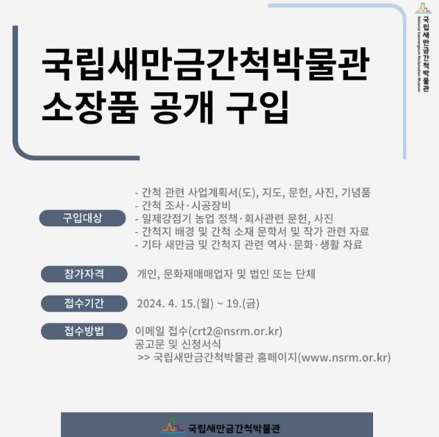 소장품 매도를 희망하는 개인소장자, 문화재매매업자, 법인 등 누구나 신청 할 수 있으며, 자세한 공고 내용 및 신청 서식은 국립새만금간척박물관 홈페이지 새소식(공지사항)을 통해 내려받을 수 있다.