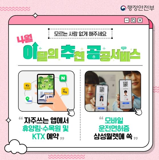 4월의 추천 공공서비스는 ‘민간앱을 통한 공공서비스 예약’과 ‘모바일 신분증’으로,봄 나들이 시즌을 맞아 열차와 휴양시설 예매 시 편의성, 각종 할인 혜택 적용 시 신분 확인의 유용성 측면에서 이달의 공공서비스로 선정됐다.