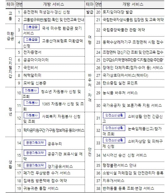 행정안전부는 지난해 10월부터 국민·기업 수요조사, 아이디어 공모전, 포털 검색데이터 분석 등을 토대로 서비스 소관기관과 협의를 거쳐 9개 분야 38종 서비스를 신규 개방 대상으로 선정했다.