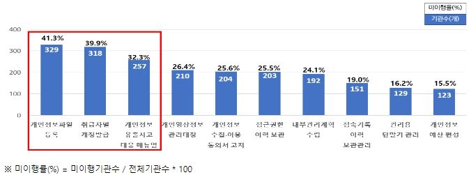 반면, 기관 및 기관장의 개인정보 보호수준 제고를 위한 노력도와 관리・감독의 적정성에 대한 7개 정성지표로 이루어진 전문가 심층진단에서는 7개 지표 모두 전반적으로 점수가 낮게 나타났다. 특히 미흡한 지표는 △개인정보 안전조치의 적절성 및 개선노력(2.32점/6점), △개인정보 보호‧관리의 적절성 및 유출‧침해 대응계획(2.54점/6점) 등으로 나타났다.