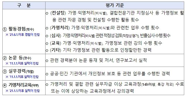 또한, 지식과 경험이 풍부한 가명정보 전문가 확보를 위해 활동경험의 평가비중은 높이고, 연구실적을 평가항목에 포함시켰다.