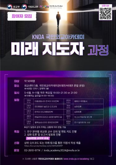 [제주교통복지신문 박상현 기자] 외교부 국립외교원은 5월 16일부터 약 5개월간 대학원생(석·박사 연구자) 및 외교·안보 종사자 대상 국민외교아카데미 “미래 지도자 과정”을 운영한다. 2021년에 시작되어 4년 차를 맞이한 국민외교아카데미는 신진 전문가 육성을 위한 심화과정으로서 올해부터 해당 과정을 신설했다.