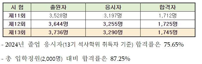 [제주교통복지신문 박상현 기자] 법무부는 4월 16일 「변호사시험 관리위원회」 심의의견과 대법원, 법학전문대학원협의회, 대한변협 등 유관기관 의견을 종합하여 제13회 변호사시험 합격자를 1,745명(총점 896.02점 이상)으로 결정했다.