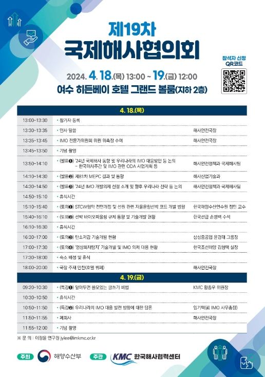 [제주교통복지신문 박상현 기자] 해양수산부는 4월 18일부터 19일까지 2일간 여수 히든베이호텔에서 ‘제19차 국제해사협의회’를 개최한다.