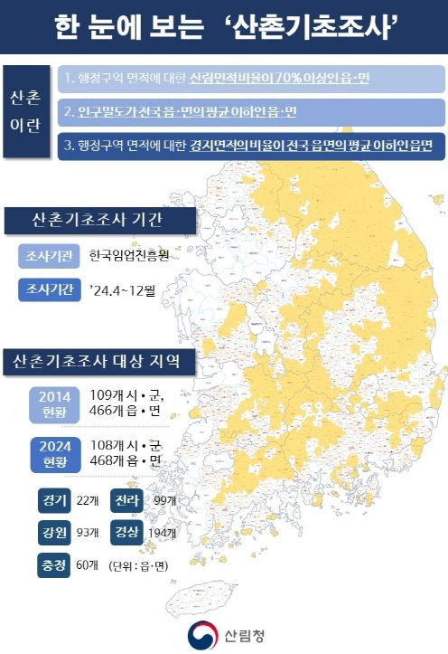산촌기초조사는 산촌진흥기본계획 수립을 위해 10년에 한 번씩 실시하는 법정 조사로 산촌지역의 산림자원 분포 및 이용, 산촌 인구변동 추이, 산촌경제 등 8가지 항목을 조사한다.
