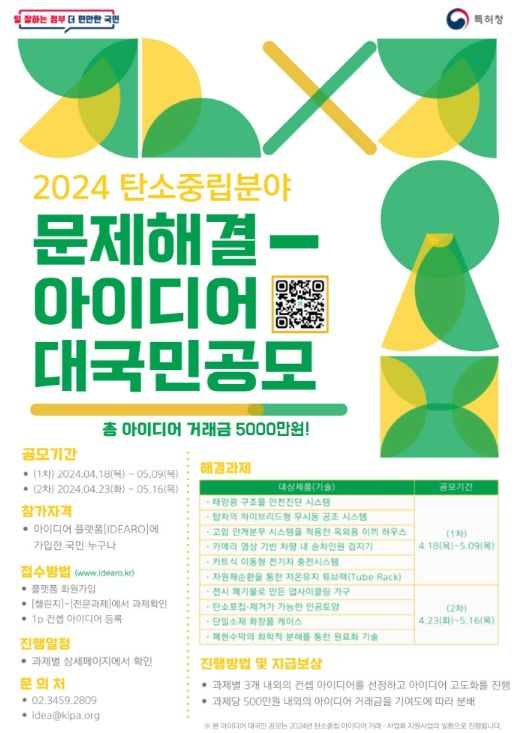 [제주교통복지신문 송한신 기자] 특허청은 4월 18일부터 5월 16일까지 기후변화 대응 및 정부혁신의 일환으로 ‘2024년 탄소중립분야 문제해결 아이디어 대국민 공모’를 실시한다고 밝혔다.