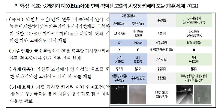 금번 2차로 공고될 과제는 모빌리티 분야는 ➊비‧안개 등 악천후에서도 정확하게 볼 수 있는 자율주행 센서‧카메라, ➋96%이상 하이니켈계 이차전지, ➌메탄올 추진선 엔진 핵심부품 개발 등이 포함됐다.