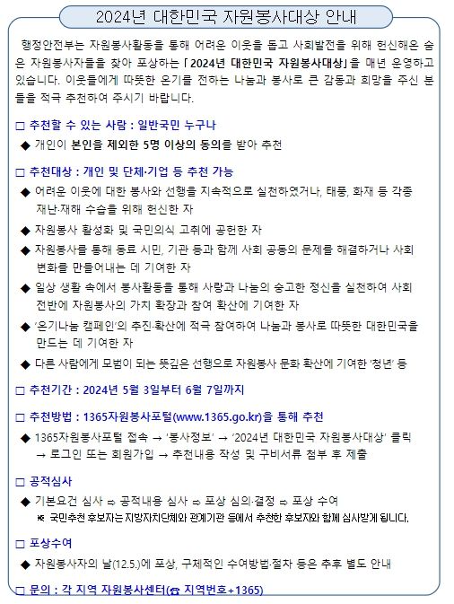 [제주교통복지신문 박상현 기자] 행정안전부는 국가와 사회에 헌신한 숨은 자원봉사자를 찾아 포상하는 ‘2024년 대한민국 자원봉사대상’ 후보자를 5월 3일부터 6월 7일까지 접수한다고 밝혔다.