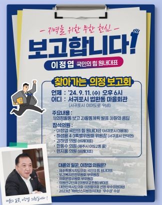국민의힘 이정엽 대표 의원은, 오는 11일 오후 6시 서귀포시 법환동 마을회관(서귀포시 이어도로 968)에서 지난 2년 간의 의정활동 성과와 앞으로의 활동 계획을 주민들과 공유하는 ‘찾아가는 의정 보고회’를 가질 예정이다.