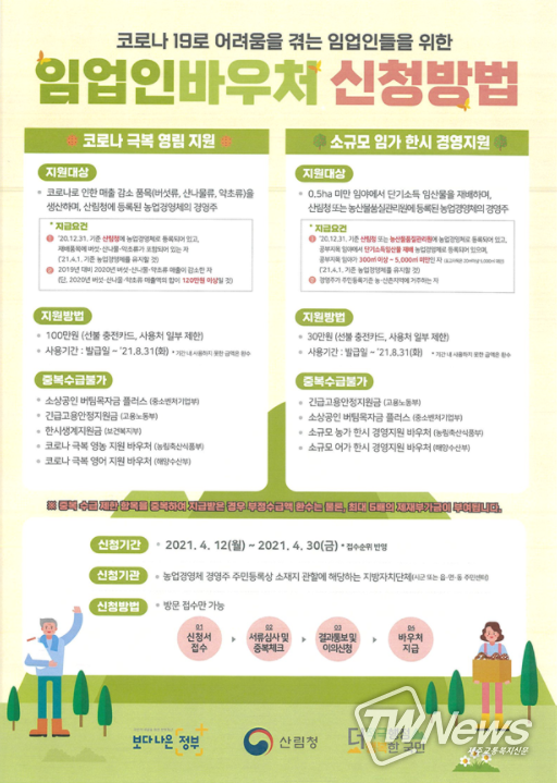 주요내용을 살펴보면 소규모 임가 한시적 경영지원과 코로나 극복 영림바우처로 구분되며, 지원대상으로는 단기소득 임산물을 생산하거나 전년도에 비해 매출이 감소된 품목을 생산하고 있는 농업경영체에 등록된 임업인으로 지원규모는 각각 임가당 30만원과 100만원이다.