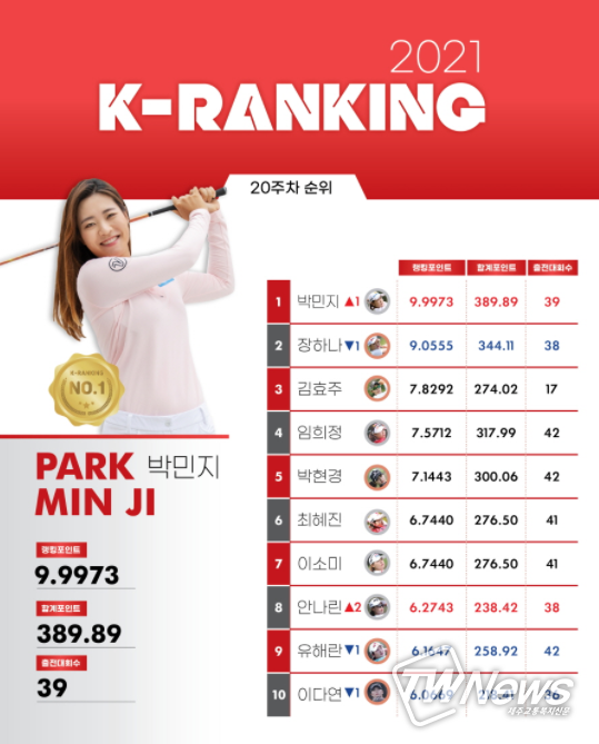 박민지는 ‘2021 NH투자증권 레이디스 챔피언십’ 우승으로 71포인트를 획득하며 ‘2021년 20주차 K-랭킹’에서 랭킹 포인트 9.9973를 쌓아 지난주 2위에서 1위로 한 계단 올라섰다.
