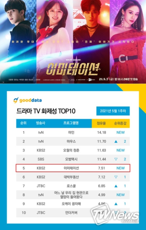 특히 ‘이미테이션’은 지난 12일 굿데이터코퍼레이션이 발표한 5월 1주차 ‘드라마 TV 화제성’ 순위에 5위로 진입하며 강력한 화제성을 입증했다.