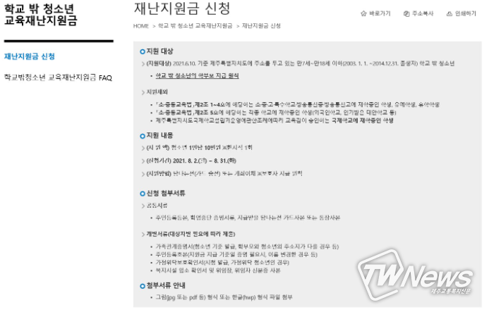 신청 대상은 2021년 6월 10일 기준 제주도에 주소를 두고 있는 만 7∼18세 이하 학교 밖 청소년이다.