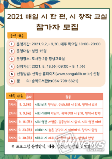 [제주교통복지신문=박희찬 기자] 제주도교육청 송악도서관은 지역 주민을 대상으로 시를 읽고 쓰는 과정을 통한 자아탐구 및 자기표현의 기회를 마련하고자‘2021년 매일 시 한 편, 시 창작 교실’수강생을 모집한다.