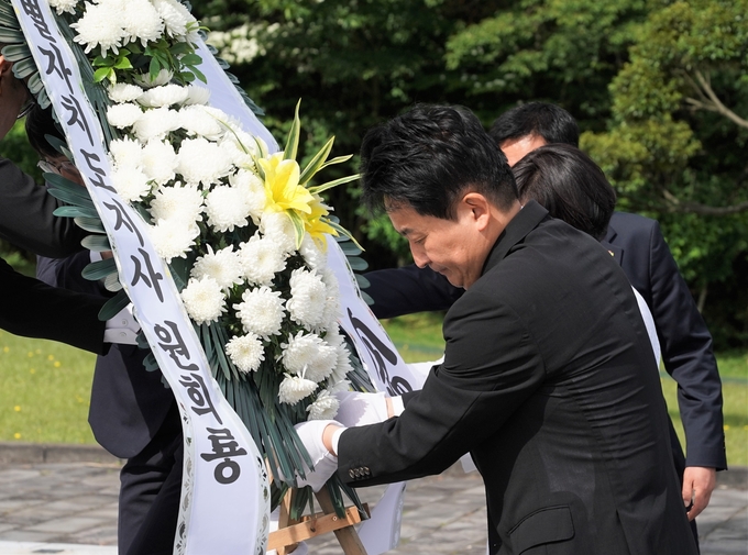 원희룡 제주도지사 당선자는 14일, 충혼묘지와 4.3평화공원을 잇따라 참배한 데 이어 도청 간부들과 티타임을 가졌다.