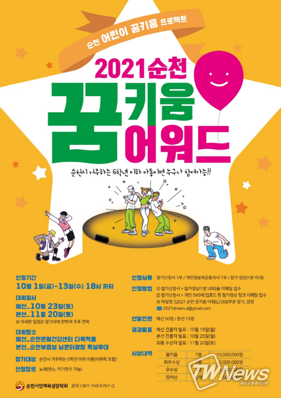 [제주교통복지신문 김지홍 기자] 재단법인 순천시인재육성장학회는 순천의 어린 예능인재 발굴을 위해 ‘2021 순천 꿈키움 어워드’를 개최한다.