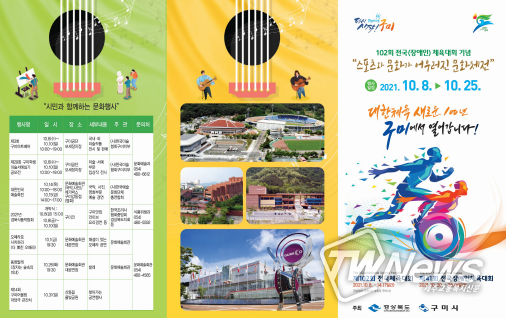 [제주교통복지신문 김지홍 기자] 구미시는 대한민국 스포츠역사이자 대국민 축제인「제102회 전국체육대회」및「제41회 전국장애인체육대회」개최에 즈음하여 “디지털 아트 전시회”, “대한민국 중견작가 특별전”, “구미 희망을 노래하다!”, 등 다채로운 전시와 기획공연으로 지역문화예술계에 활력을 불어넣고 전 시민이 함께 즐기는 축제의 장을 펼칠 예정이다.