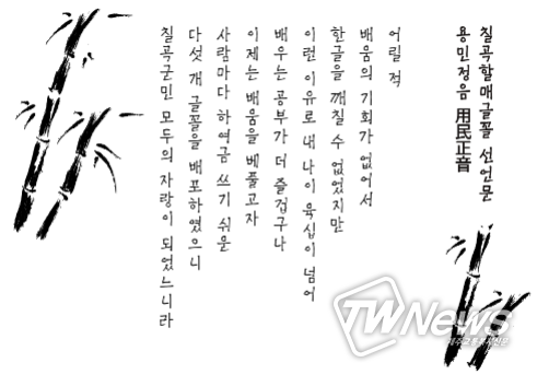 [제주교통복지신문 김지홍 기자] “어릴 적 배움의 기회가 없어서 한글을 깨칠 수 없었지만 이런 이유로 내 나이 육십이 넘어 배우는 공부가 더 즐겁구나. 이제는 배움을 베풀고자 사람마다 하여금 쓰기 쉬운 다섯 개 글꼴을 배포하였으니 칠곡군민 모두의 자랑이 되어라”