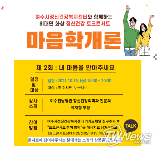 [제주교통복지신문 김지홍 기자] 여수시는 여수시민을 대상으로 오는 15일 ‘마음학개론’ 비대면 정신건강 토크콘서트를 개최한다고 밝혔다.