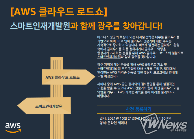 [제주교통복지신문 신혜정 기자] 아마존웹서비스(AWS) 클라우드 로드쇼는 AWS에서 제공하는 다양한 인공지능(AI)과 머신러닝(ML) 서비스 및 적용사례와 함께, 소프트웨어 개발업체들에게 클라우드 노하우를 전하기 위한 행사로 이번 광주에서 스마트인재개발원과 공동 주최로 마련된다.