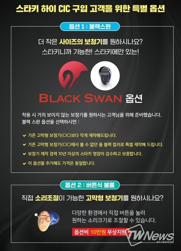 스타키그룹은 귓속형 보청기 스타키 하이 고막형(CIC) 구입 고객을 위해 두가지 옵션을 무료로 제공한다고 전했다.