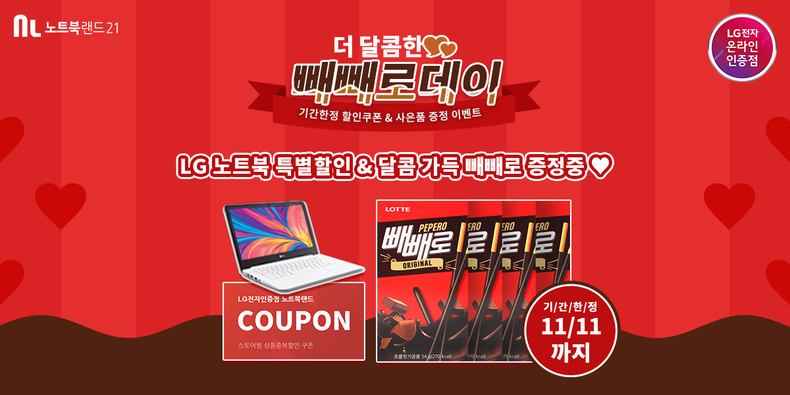 [제주교통복지신문 신혜정 기자] LG전자 온라인 인증점 노트북랜드21 이 빼빼로데이를 맞이해 ‘더 달콤한 빼빼로데이’ 이벤트를 진행한다.