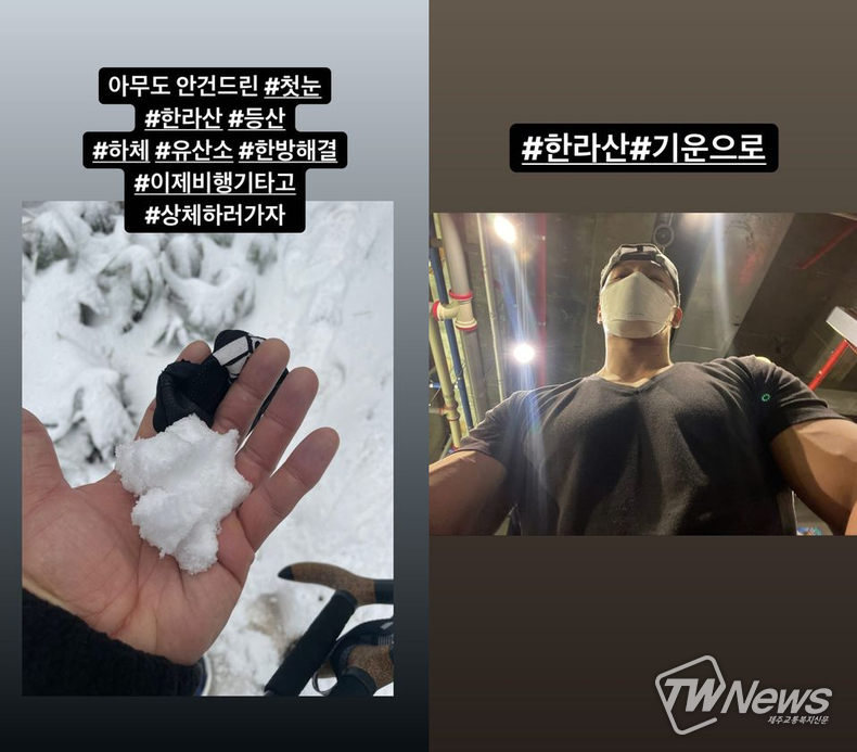 다른 한 장의 사진에는 운동에 전념한 자신의 모습이 담겼다. 사진 위에는 ‘#한라산 #기운으로’라는 글이 적혀있다.