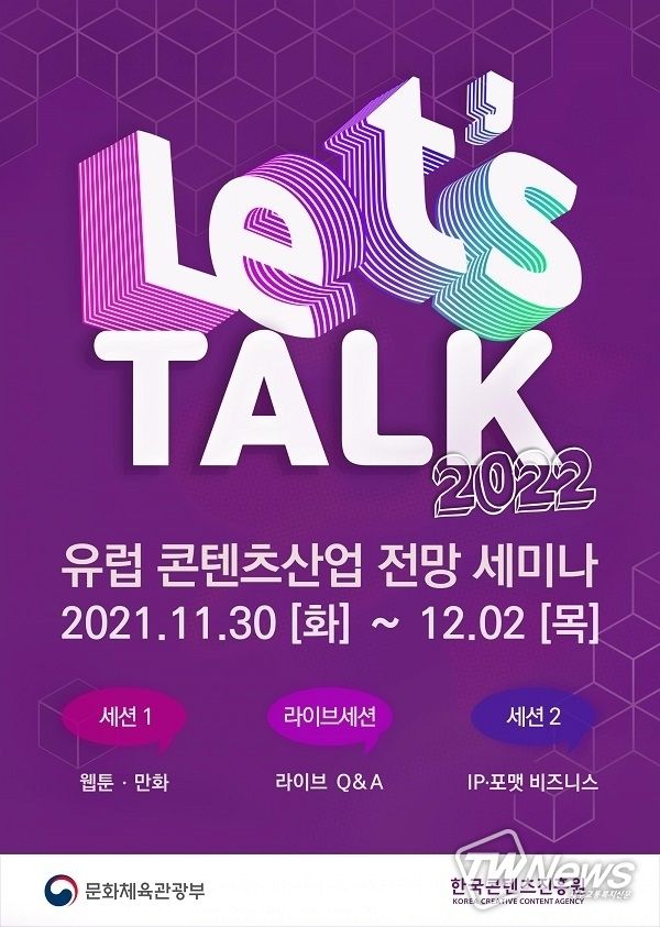 [제주교통복지신문 신혜정 기자] 문화체육관광부(장관 황희)와 한국콘텐츠진흥원(원장 조현래, 이하 콘진원)은 11월 30일(화)부터 12월 2일(목)까지 3일간 ‘LET’S TALK 2022 유럽 콘텐츠산업 전망 세미나’를 프랑스 파리에서 개최한다.