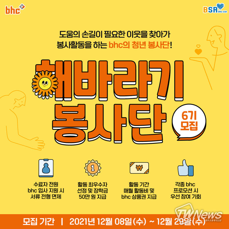 다가오는 2022년에 bhc와 함께 할 6기 bhc ‘해바라기 봉사단’을 모을 오는 29일까지 진행을 한다.