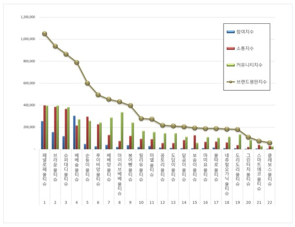 2위, 브라운 물티슈 브랜드는 참여지수 156,255 소통지수 384,602 커뮤니티지수 396,252가 되면서 브랜드평판지수 937,109로 분석됐다. 지난 11월 브랜드평판지수 823,839와 비교하면 13.75% 상승했다.