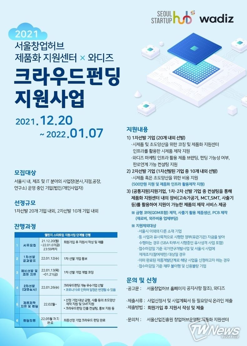 서울시의 창업지원 기관인 서울창업허브는 와디즈와 함께 ‘2021 서울창업허브 제품화 지원센터 크라우드펀딩 지원사업’에 참여할 스타트업을 내년 1월 7일까지 모집한다.