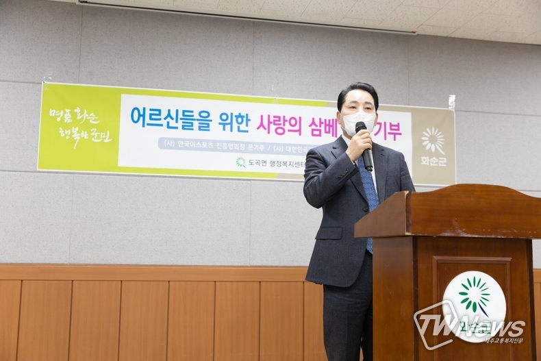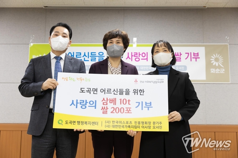[제주교통복지신문 신혜정 기자] ㈔한국e스포츠진흥협회 문기주 총회장과 ㈔대한민국가족지킴이 오서진이 이사장이 17일 문 총회장의 고향인 전남 화순군 도곡면을 방문해 삼베 원단과 쌀을 기탁했다.