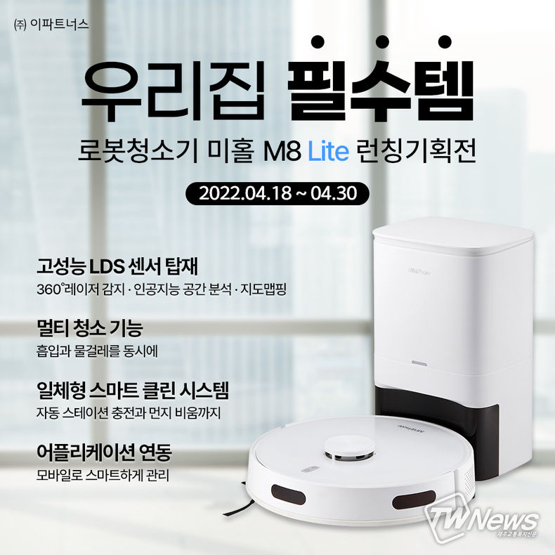 [제주교통복지신문 김대훈 기자] 가전제품 전문몰 ‘이파트너스’가 신제품 ‘샤오미 미홀 M8 lite 로봇청소기’ 론칭 기념으로 사전 예약 판매 행사를 진행한다고 19일 밝혔다.