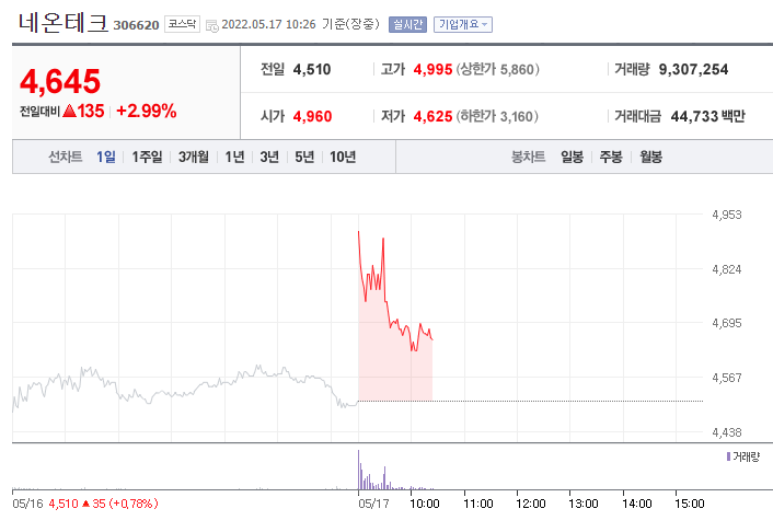17일 오전 10시 26분 기준 네온테크는 전 거래일 대비 2.99% 상승한 4645원에 거래 중이다.