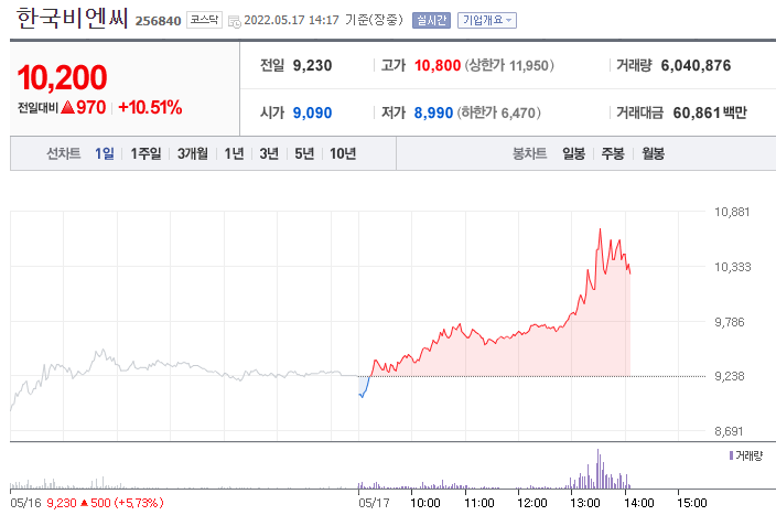 17일 오후 2시 17분 기준 전 거래일 대비 970원(10.51%) 오른 1만200원에 거래 중이다.