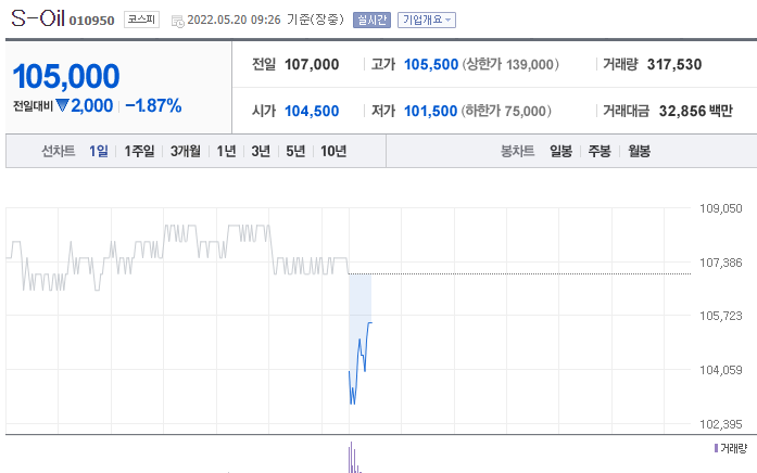 20일 오전 9시 16분 기준 S-Oil은 전 거래일 대비 1.87%(2000원) 내린 10만5000원에 거래 중이다.