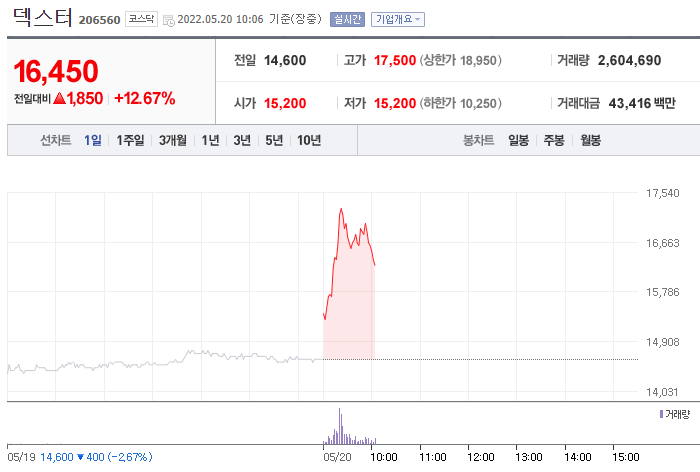 20일 오전 10시 06분 기준 덱스터는 전 거래일 대비 12.67%(1850원) 오른 1만6450원에 거래 중이다.