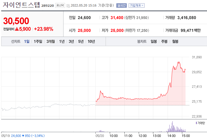 20일 오후 3시 16분 기준 자이언트스텝의 주가는 전일 대비 23.98%(5900원) 오른 3만500원에 거래되고 있다.