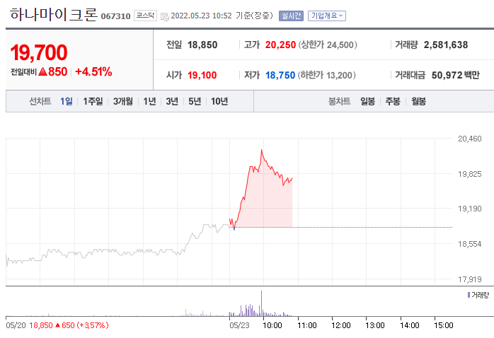 하나마이크론은 23일 오전 10시 52분 기준 전 거래일 대비 4.51%(850원) 상승한 1만9700원에 거래되고 있다.