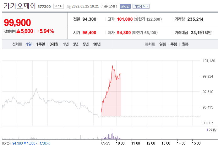 카카오페이는 25일 오전 10시 21분 기준 전 거래일대비 5.94%(5600원) 오른 9만9900원에 거래되고 있다.