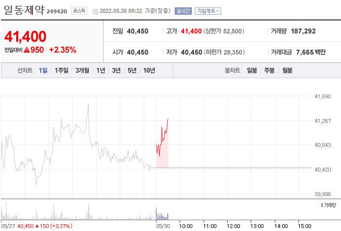 30일 오전 9시 32분 기준 일동제약의 주가는 전 거래일 대비 2.35%(950원) 상승한 4만1400원에 거래되고 있다.