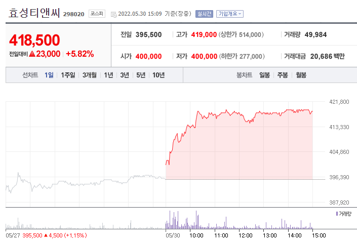 30일 오후 2시 48분 기준 효성티앤씨의 주가는 전 거래일 대비 5.82%(2만3000원) 상승한 41만8500원에 거래되고 있다.