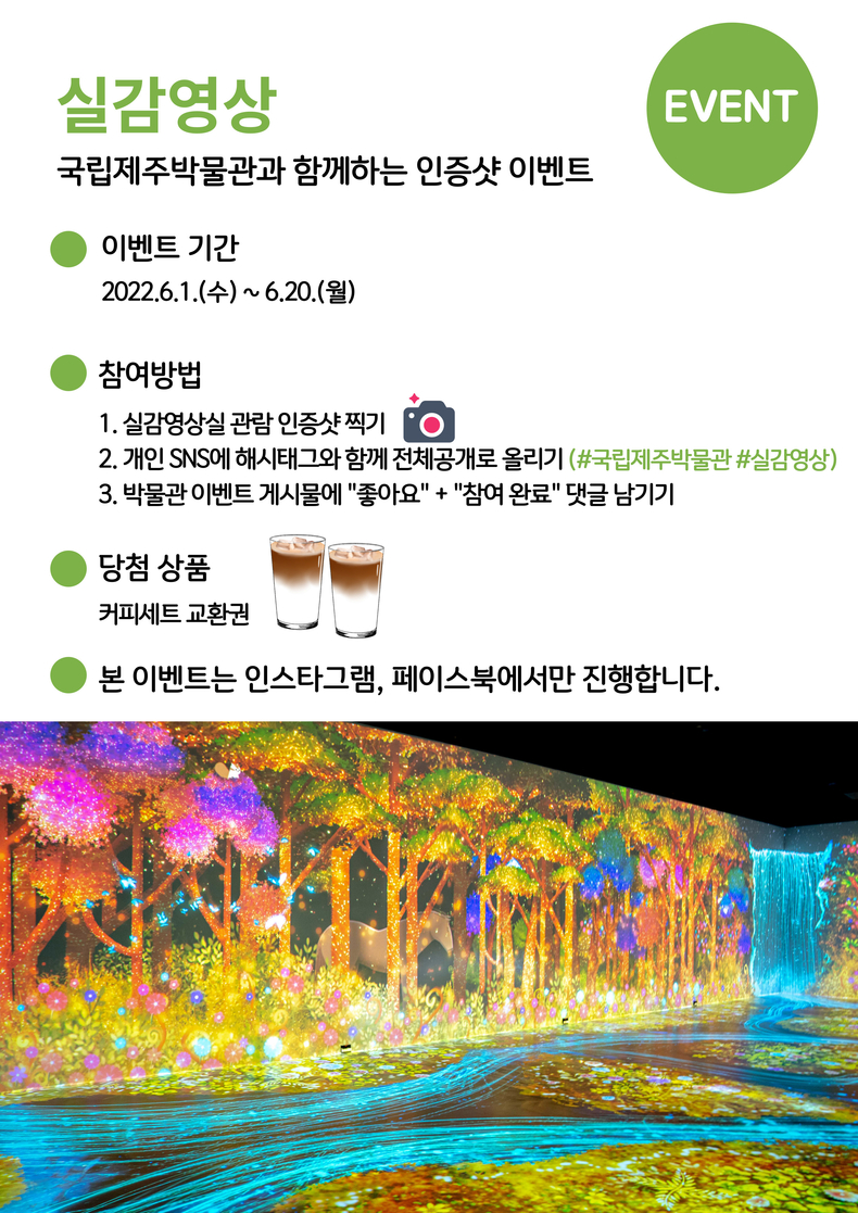 이벤트 참여 방법은 개인 인스타그램, 페이스북에 실감영상 관람 인증사진을 게시하고 국립제주박물관 공식 인스타그램, 페이스북 게시물에 참여 댓글로 응모할 수 있다.
