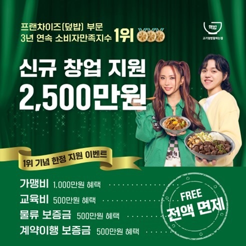 또한 핵밥은 프랜차이즈(덮밥) 부문 3년 연속 소비자만족지수 1위를 기념해 200호점 한정 창업 프로모션을 선보였다. 해당 프로모션은 200호점까지만 한정으로 신규창업 가맹비, 보증금, 물류 보증금, 교육비를 포함해 총 2500만원을 지원하는 혜택을 담았다. 프로모션 참여자는 최대 3000만원 본사 무이자대출도 받을 수 있다.