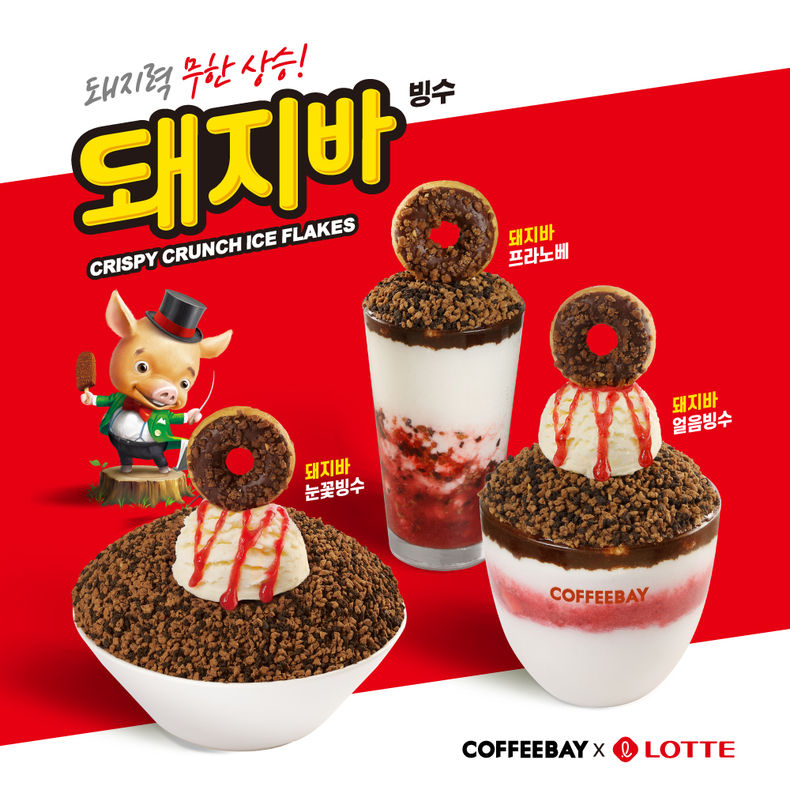 돼지바 콜라보 메뉴는 바삭한 돼지바 크런치와 부드러운 우유 얼음이 환상의 조화를 이루는 ‘돼지바 눈꽃빙수’, 시원한 얼음을 아삭하게 즐길 수 있는 ‘돼지바 얼음빙수’, 돼지바 아이스크림을 음료로 즐길 수 있는 ‘돼지바 프라노베’로 구성해 취향에 맞게 골라 먹을 수 있다.