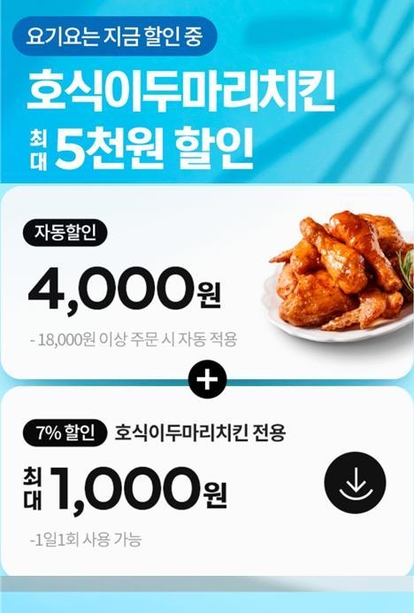 [제주교통복지신문 이소민 기자] 치킨 프랜차이즈 대표 브랜드 호식이두마리치킨(대표: 홍윤원)이 배달앱 요기요 지금 할인 중 프로모션을 통해 전 메뉴 5천원(4000원+7% 최대 5000원) 할인 행사를 진행한다.